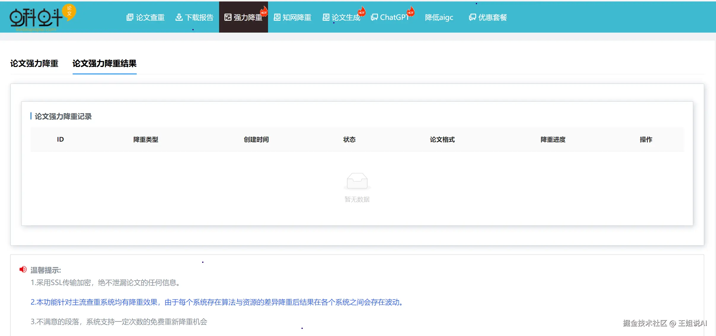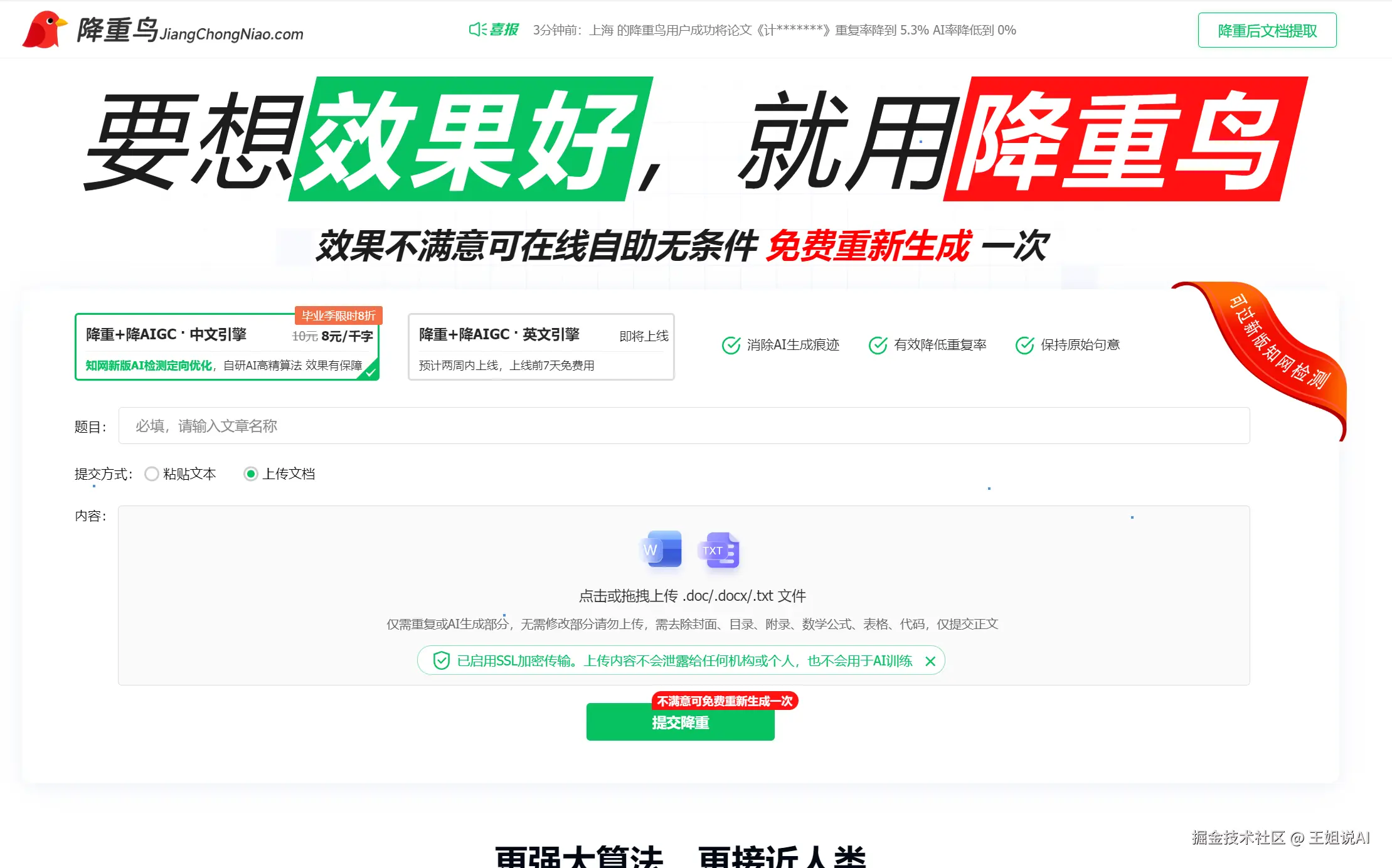 降重鸟这个工具,当真是我此番寻觅中的一大惊喜。它的功能实在丰富,既能支持粘贴文本进行降重检测,又能方便地通过文件上传检测。这般多样化的检测方式,就如同为使用者搭建了多条便捷通道,无论你以何种形式准备好论文内容,它都能迅速接手处理。倘若检测效果未能让你满意,别担心,它还给予重新生成一次的机会,这就好似为使用者备上了一道坚固的后盾,让人在降重的征程中多了一份安心。