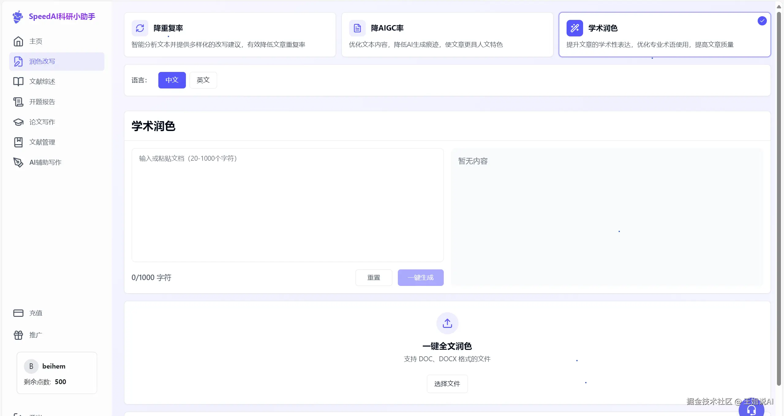SpeedAI,它专注于智能降重以及降低AI检测率这两大核心功能。值得一提的是,它对语言的支持颇为广泛,无论是中文还是英文,都能精准应对。而且,降重后的内容会贴心地保存在历史记录中,方便使用者随时查看和下载,这般细致的记录管理,为使用者的后续操作提供了极大的便利。