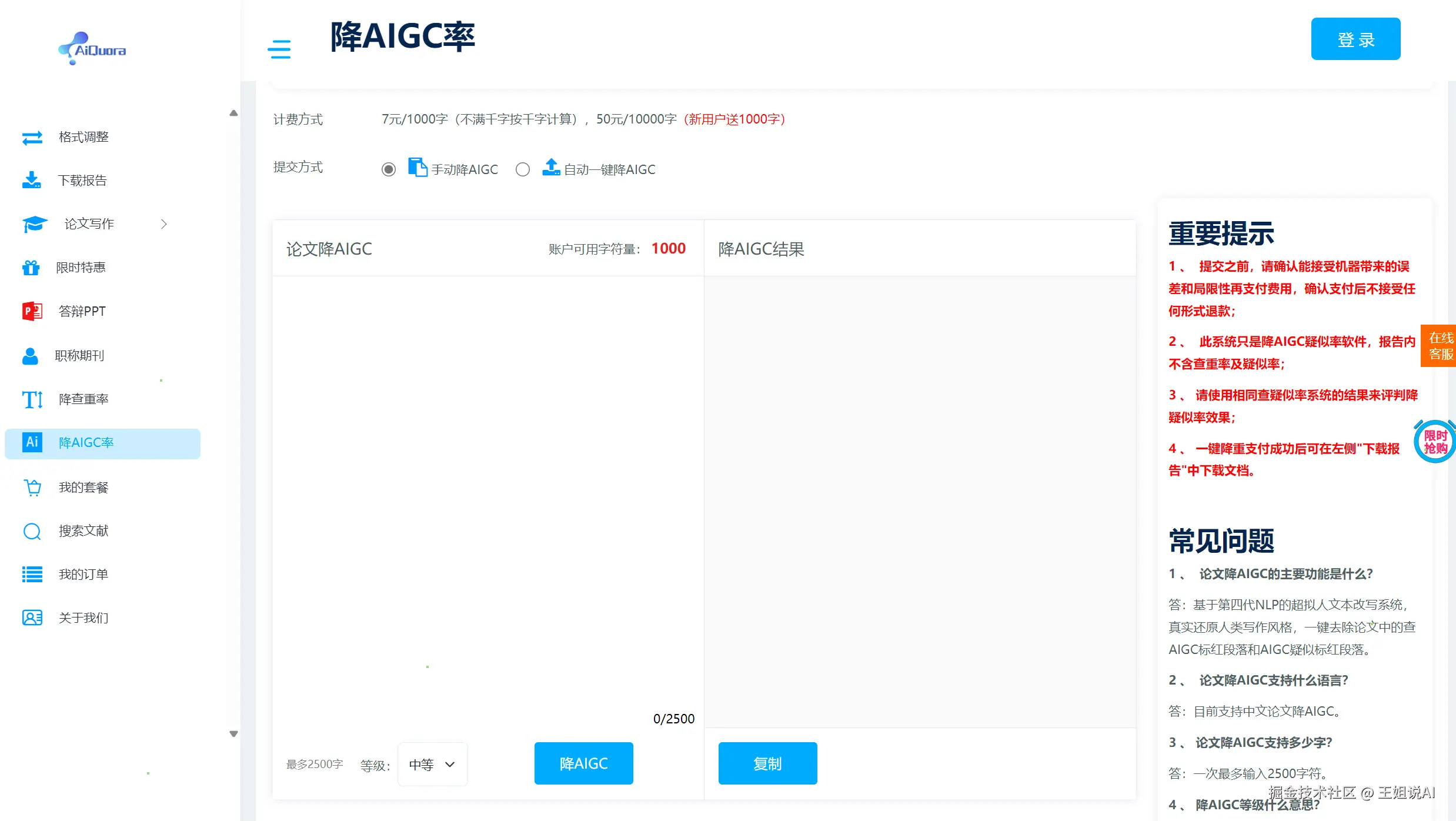 AIQuora,这是最近新出的降低AI率工具。它同样支持粘贴文字和文件上传这两种常见的输入方式,并且为使用者提供查看历史降重记录的功能。如此一来,使用者便能对自己的降重历程一目了然,从中总结经验,不断优化论文降重效果。