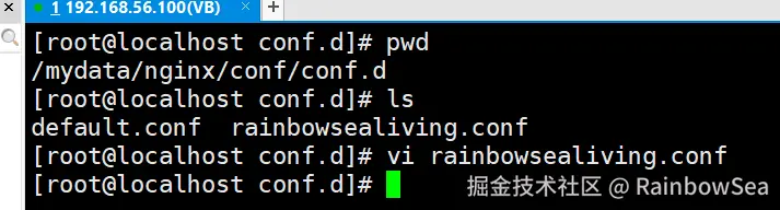 [root@localhost conf.d]# vi /mydata/nginx/conf/conf.d/rainbowsealiving.conf