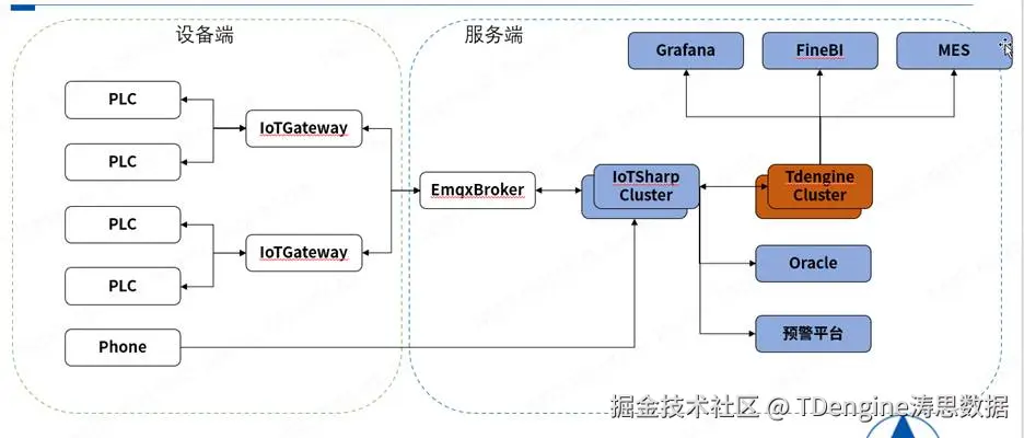 各类设备产生的 PLC 数据需通过特定协议进行采集,由 IoT Gateway(物联网网关)完成协议转换后,经由 Broker 传输至物联网基础平台集群。平台集群再将数据分别写入 TDengine 时序数据库、Oracle 数据库及预警平台。
