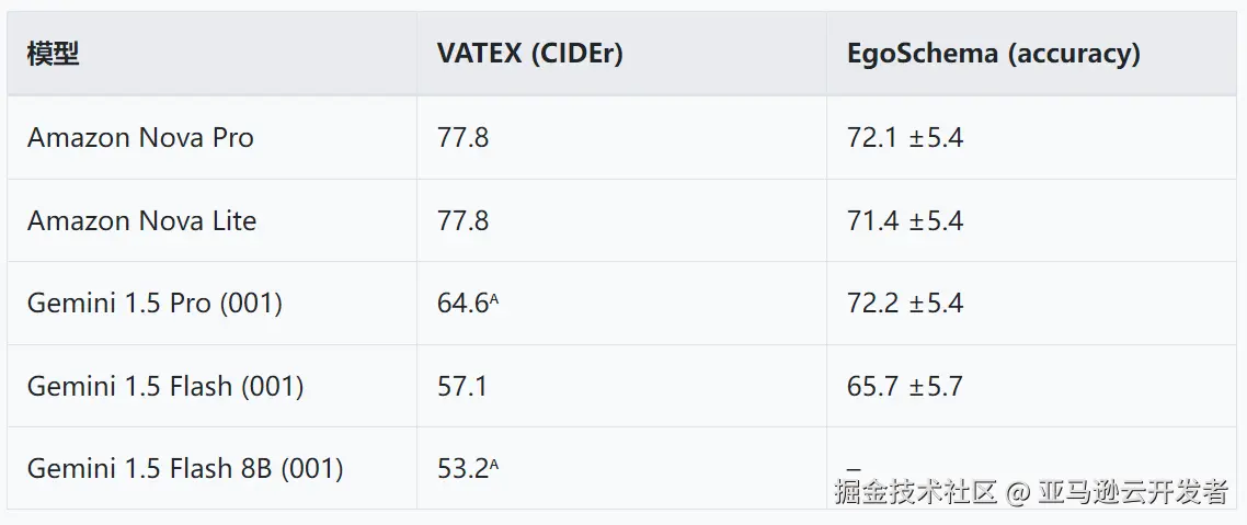 首先,模型的图像理解能力是视频审核方案选型时的核心要素。基于 Amazon Nova 系列模型的技术报告和模型卡片,Nova Lite 与 Nova Pro 在图片理解上都具有优异的表现。以下是 Nova 和 Gemini 在 VATEX 和 EgoSchema 上的对比表格,参考链接。