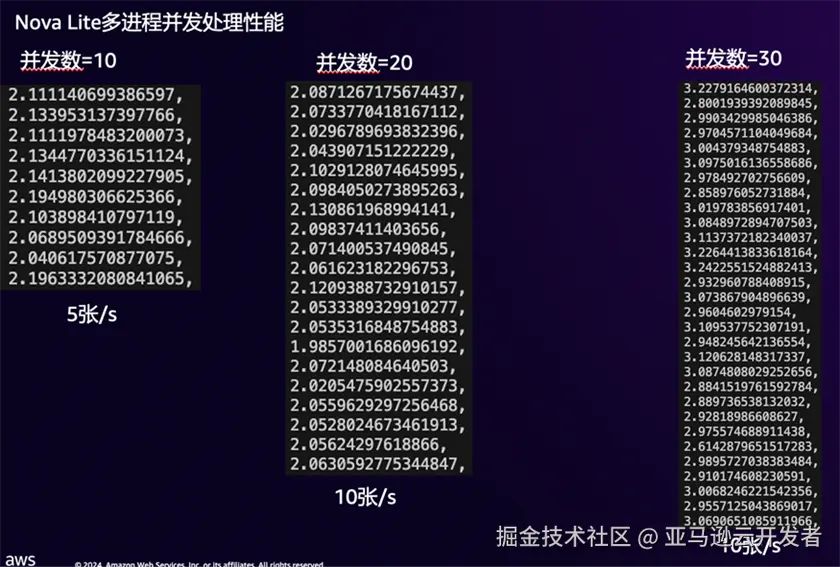 在确定了处理能力和价格优势后,我们着重对 Haiku3、Nova Lite 和 Rekognition 的处理速度进行了对比。