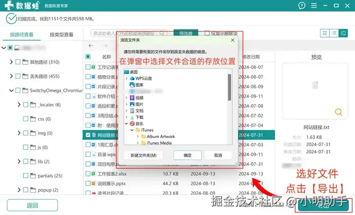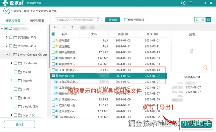 步骤2: 在软件显示完成文件扫描后,在里面可以根据扫描出来的信息(图片格式还可以显示预览图),选出合适的文件后点击【导出】;