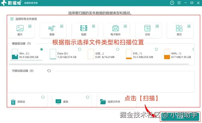 步骤1: 在软件的扫描准备页面上,根据指示,选择需要恢复的文件类型和电脑位置,点击【扫描】,让软件开始工作;