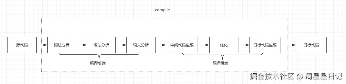 编译器其实就是一段程序,它用来将一种语言A翻译成另外一种语言B,我们称之为A为源代码,B为目标代码, 编译就是将源代码翻译为目标代码的过程。 完整的编译通常分为以下几个步骤,如图: