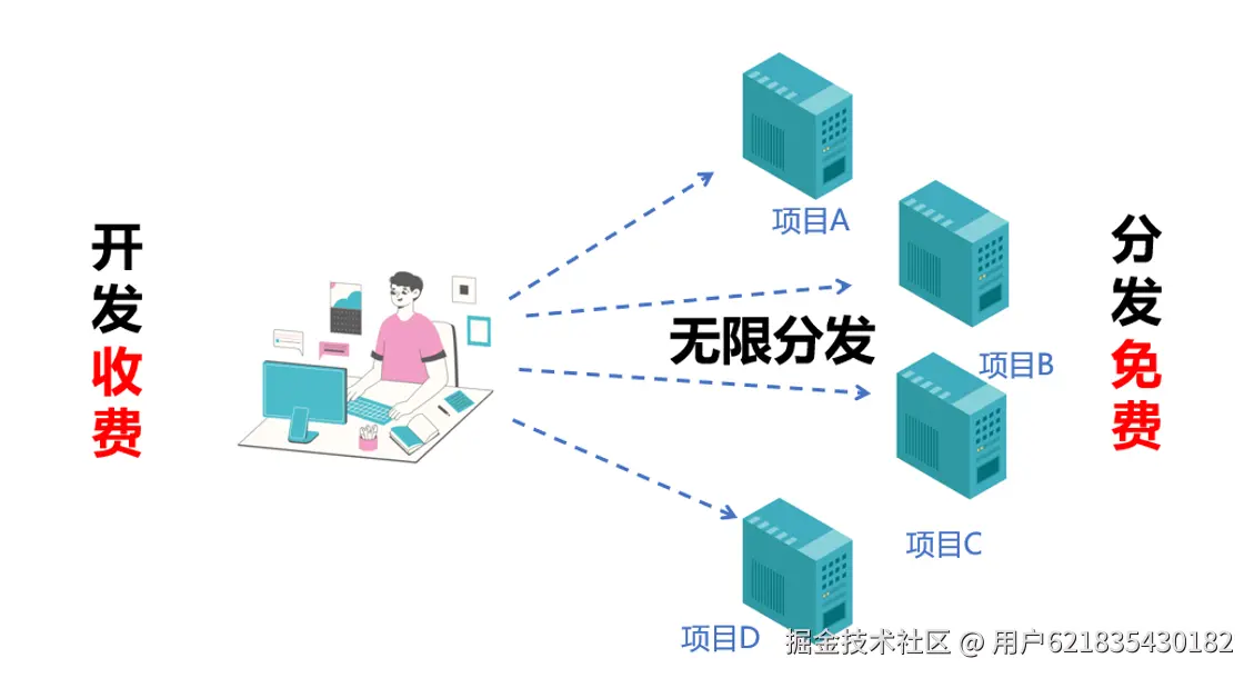 其实,大多数开发工具类的软件都是一次付费,无限使用的,比如 C++,Java 开发工具,其中附带的的类库都可以无限分发,装机量再多也不怕,反正只需要买一次