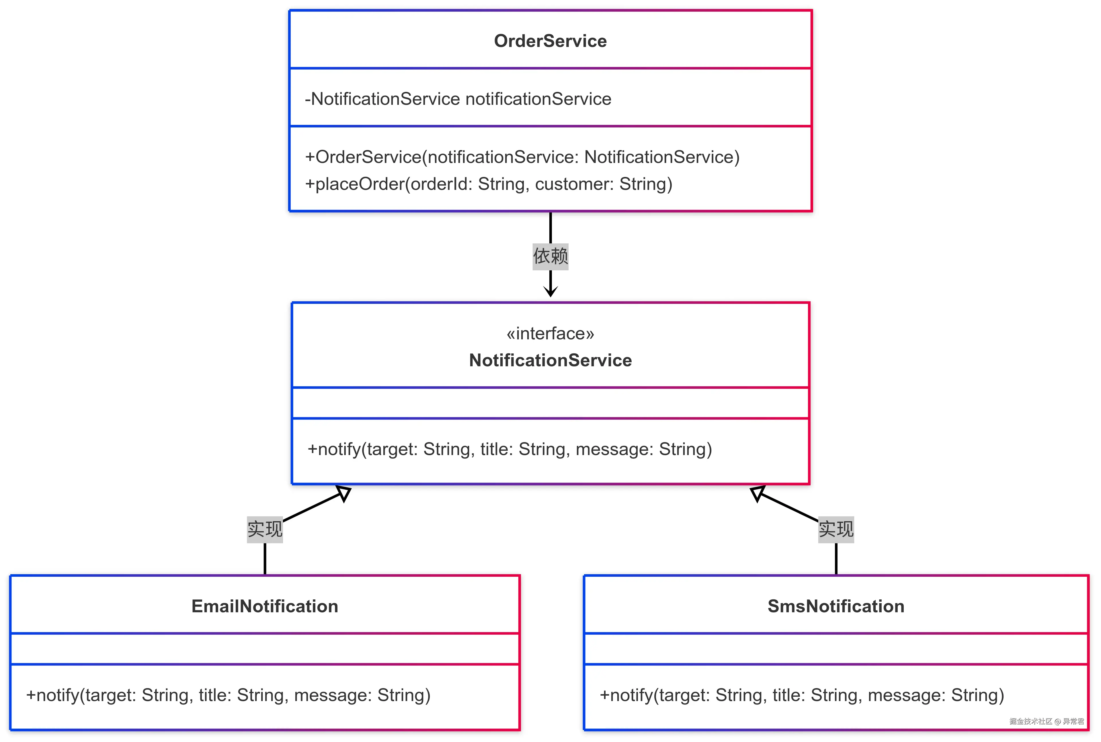 - OrderService 不再依赖具体的通知实现,而是依赖抽象的 NotificationService 接口