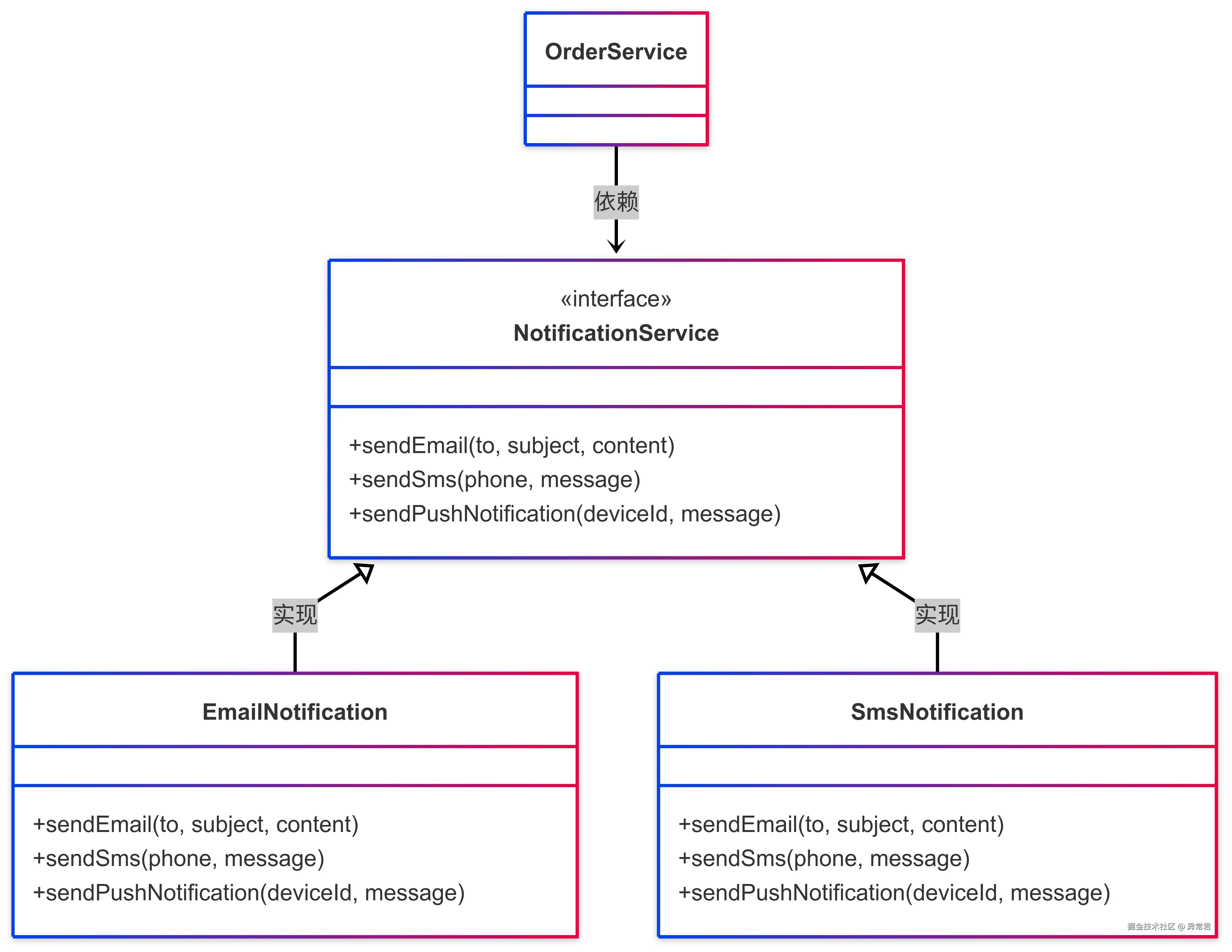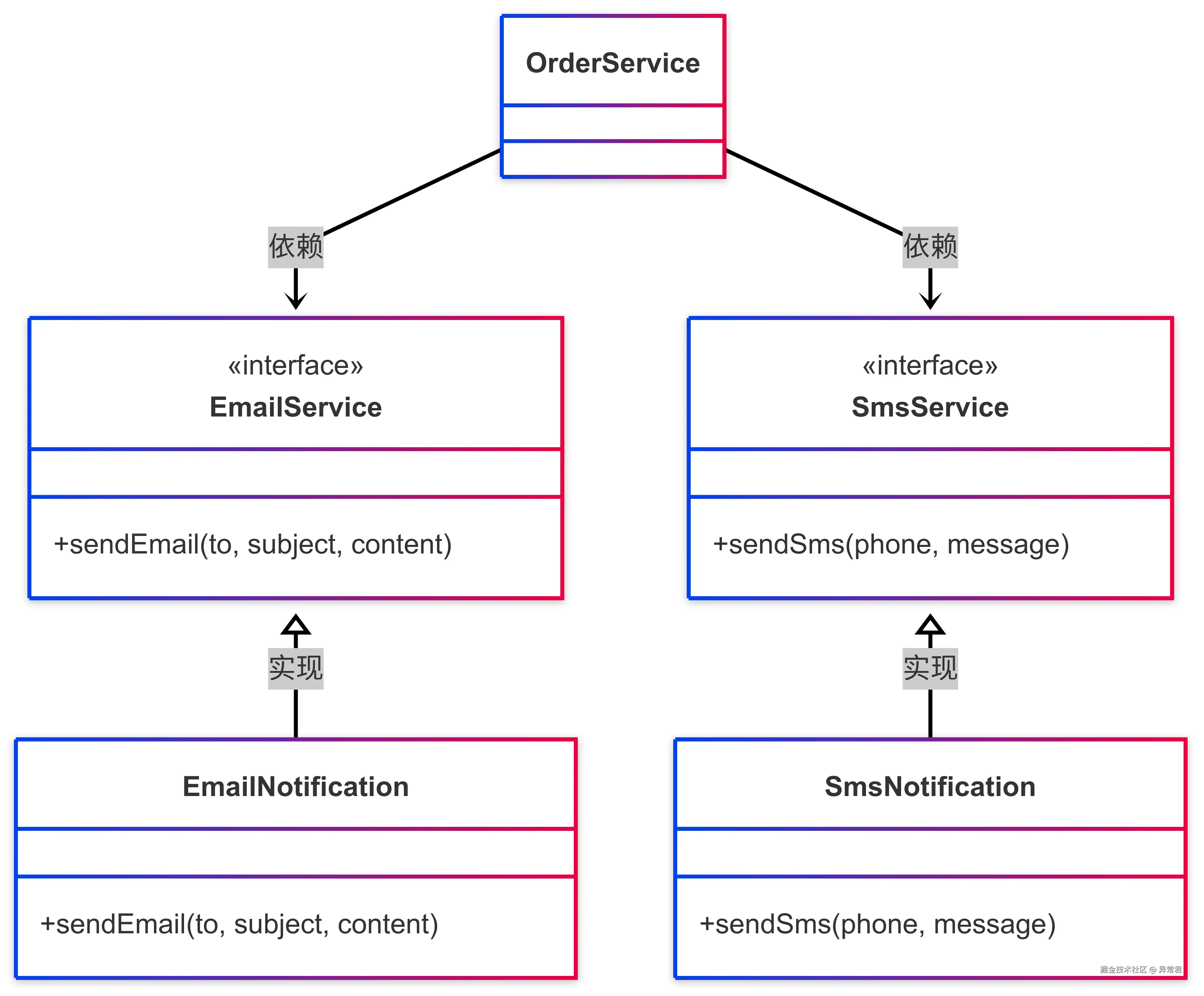 注意这里的依赖关系:OrderService 依赖于抽象的 NotificationService 接口,而 EmailNotification 和 SmsNotification 实现了这个接口。高层模块和低层模块都依赖于抽象,这正是 DIP 所要求的。