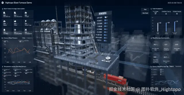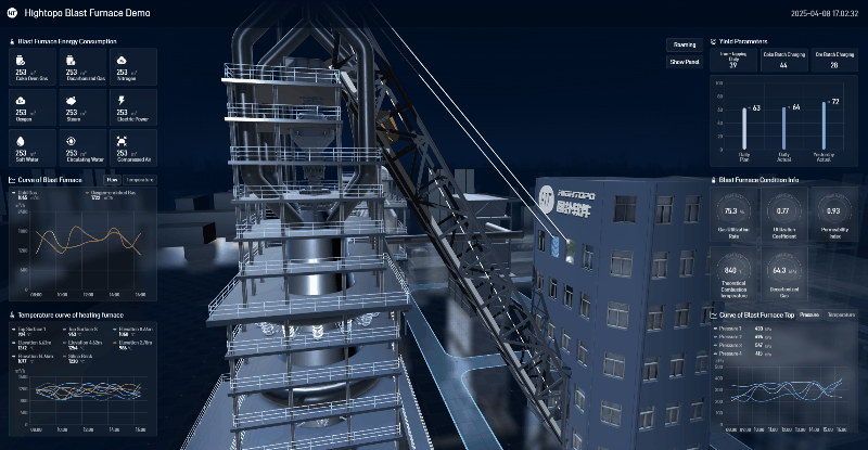 在 3D 建模与渲染方面,凭借精湛技术高度还原高炉及附属设备的复杂结构与动态运行过程,模型细节丰富、画面流畅自然,为操作人员营造出身临其境的监控操作体验。