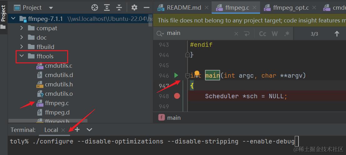 首先,打开下载的 ffmpeg 项目源码,ffmpeg.c 的代码在 fftoools 中。在同调试之前,需要在控制台 configure 一下,然后 make 来自动编译项目: