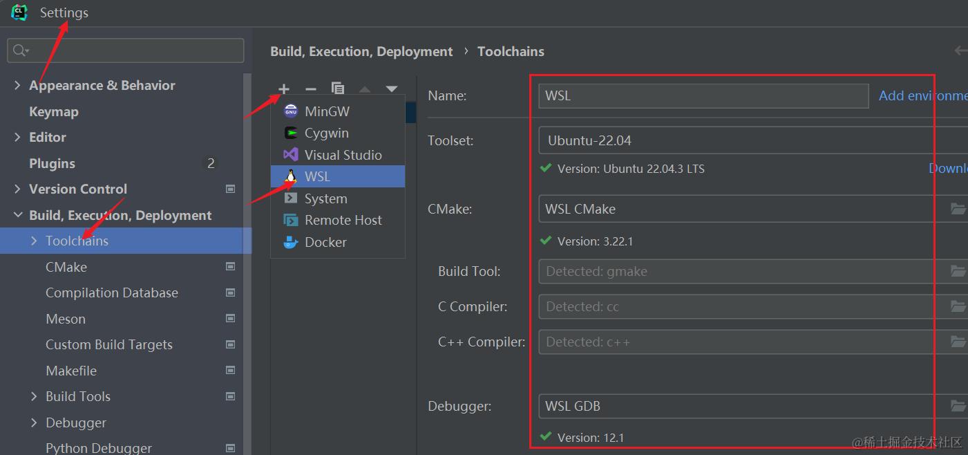 然后在 Clion 中的 Settings 中,添加工具链环境。选择 WSL :