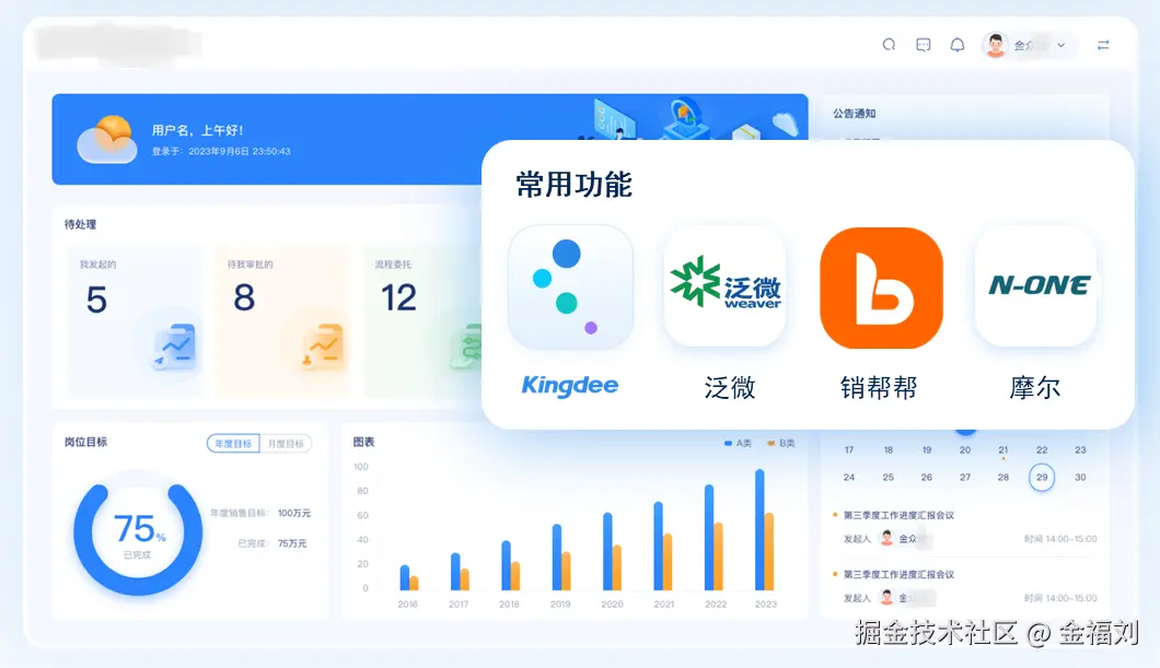 统一门户集成: 平台的门户工作台集成功能,为员工提供了一个统一的、个性化的工作入口。员工可以在一个界面访问来自不同系统的数据和应用,避免了在多个系统间频繁切换,提升了工作效率和信息获取的便捷性。这也是让整合后的数据和应用价值最大化的重要途径。