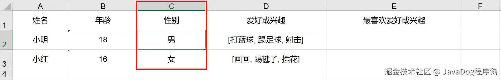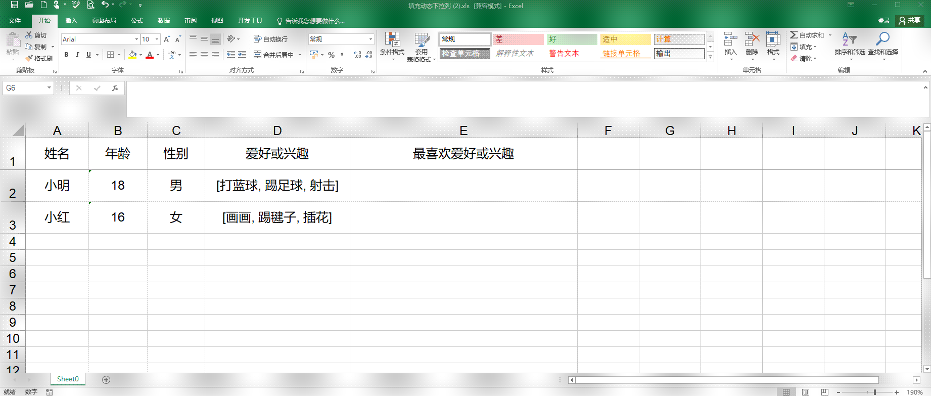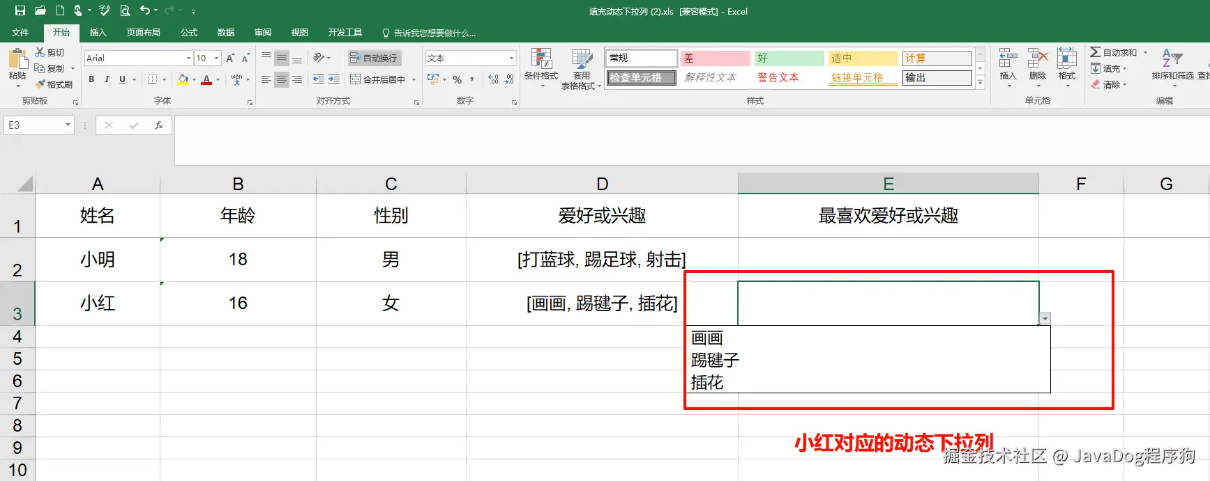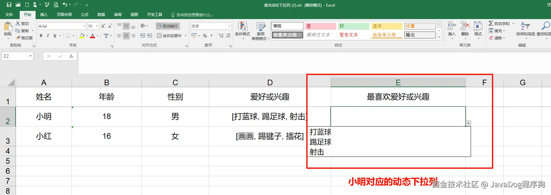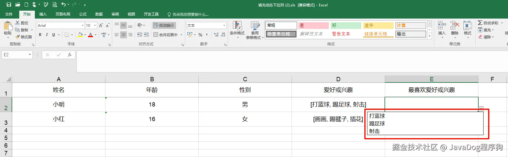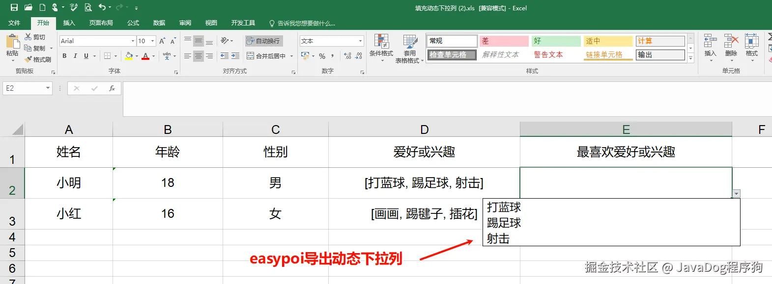 实例以学生纬度,不同学生有不同的兴趣爱好。实现导出每个人对应的最喜欢的爱好或兴趣动态下拉列表,详见下图导出excel的E列