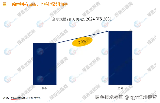 据QYResearch研究,2024年全球编码和标记设备市场规模为34.8亿美元,预计到2031年将调整至44.7亿美元,年复合增长率3.30%。销量方面,2024年达54.5万台,预计2031年增至71.8万台,年复合增长率3.98%。耗材和配件板块2024年市场规模达54亿美元。