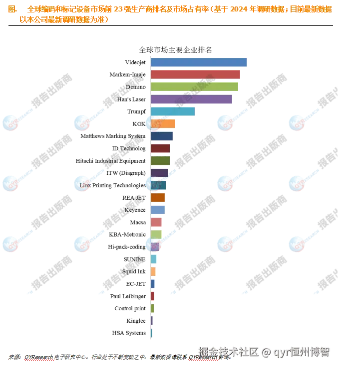 该行业格局分散,区域性供应商强势。Videojet、Markem-Imaje和Domino三大全球龙头2024年合计占25%市场份额,拥有多元技术方案和全球服务网络。