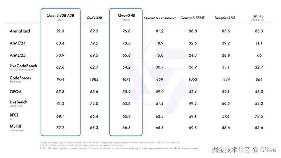 Qwen3-4B:性能可与Qwen2.5-72B-Instruct媲美,如在ArenaHard中为76.6,Qwen2.5-72B-Instruct为81.2。