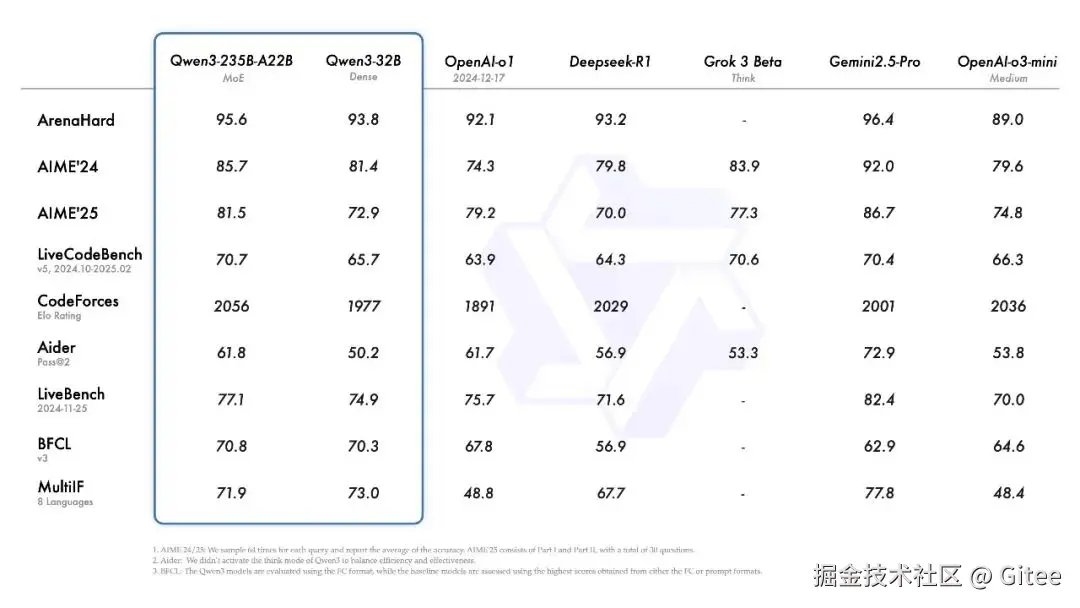 Qwen3-235B-A22B:在ArenaHard(95.6)、AIME’24(85.7)、LiveCodeBench v5(70.7)等测试中,优于DeepSeek-R1、o1、Grok-3等模型,仅在AIME’25(81.5)略低于Gemini-2.5-Pro(86.7)。