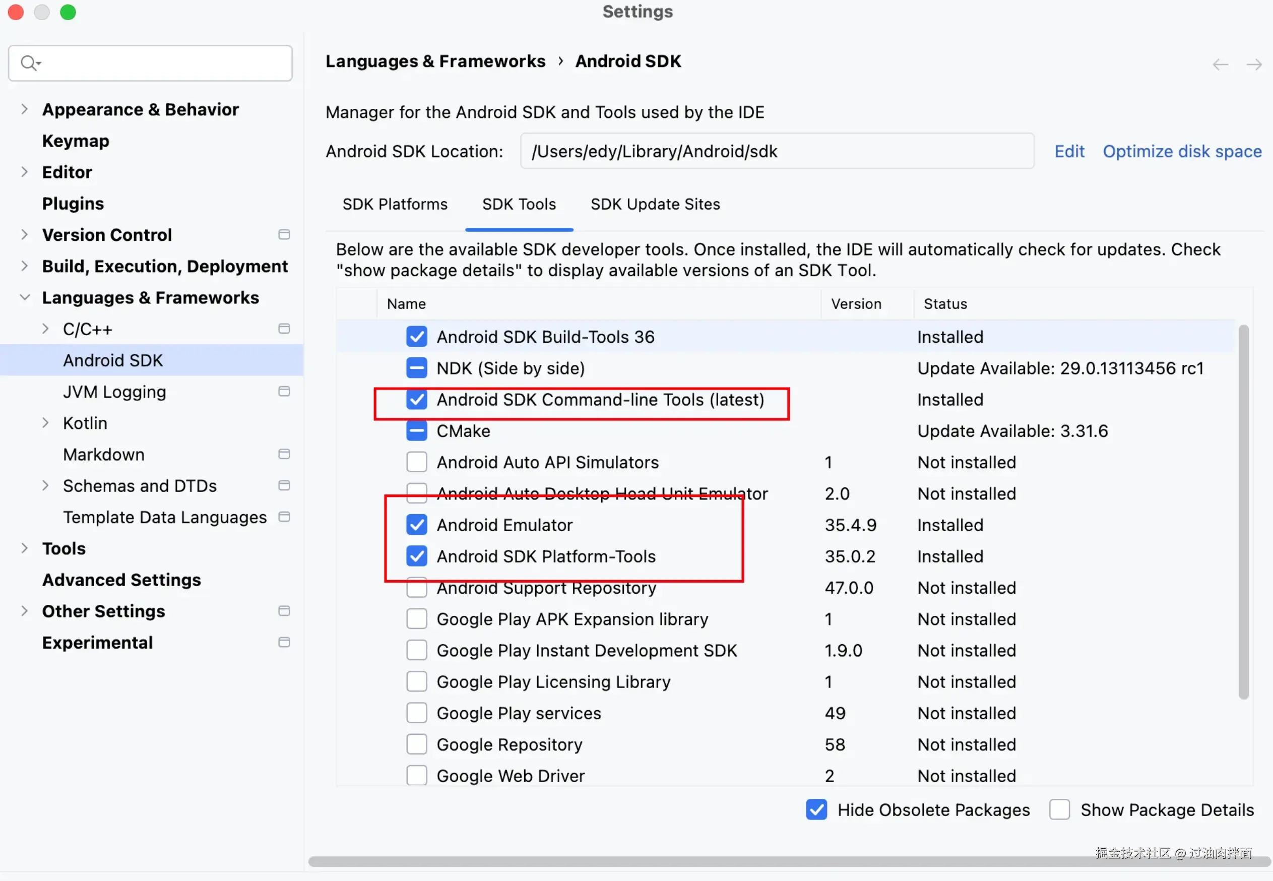 - 同上一步可以在 Settings | Languages & Frameworks | Android SDK中进行勾选安装