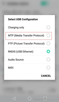 步骤 2. 在出现提示时,在手机上选择“MTP(媒体传输协议)”。