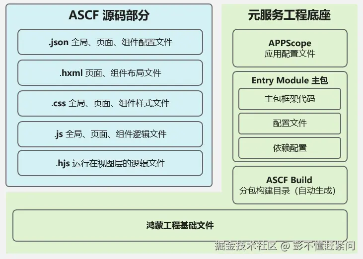 所有的代码都在ascf文件夹中使用类web语言的 hxml css js进行开发,运行时编辑器会自动编译到鸿蒙entry模块目录的rawfile文件夹中,再运行到next系统的真机中。