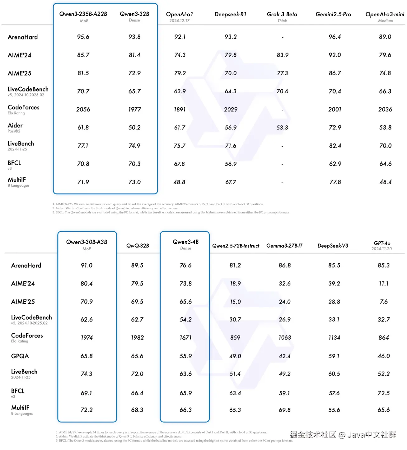 Qwen3 旗舰模型 Qwen3-235B-A22B 在代码、数学、通用能力等基准测试中,与 DeepSeek-R1、o1、o3-mini、Grok-3 和 Gemini-2.5-Pro 等顶级模型相比,表现出极具竞争力的结果。此外,小型 MoE 模型 Qwen3-30B-A3B 的激活参数数量是 QwQ-32B 的 10%,表现更胜一筹,甚至像 Qwen3-4B 这样的小模型也能匹敌 Qwen2.5-72B-Instruct 的性能,以下是测试报告:
