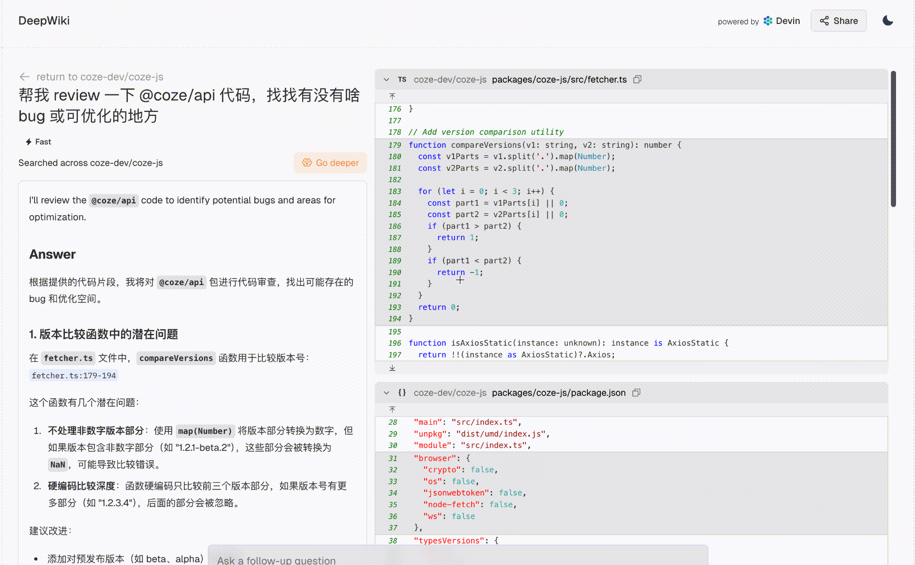 通过 coze-js 的案例,可以看出 DeepWiki 对不同人群的价值: