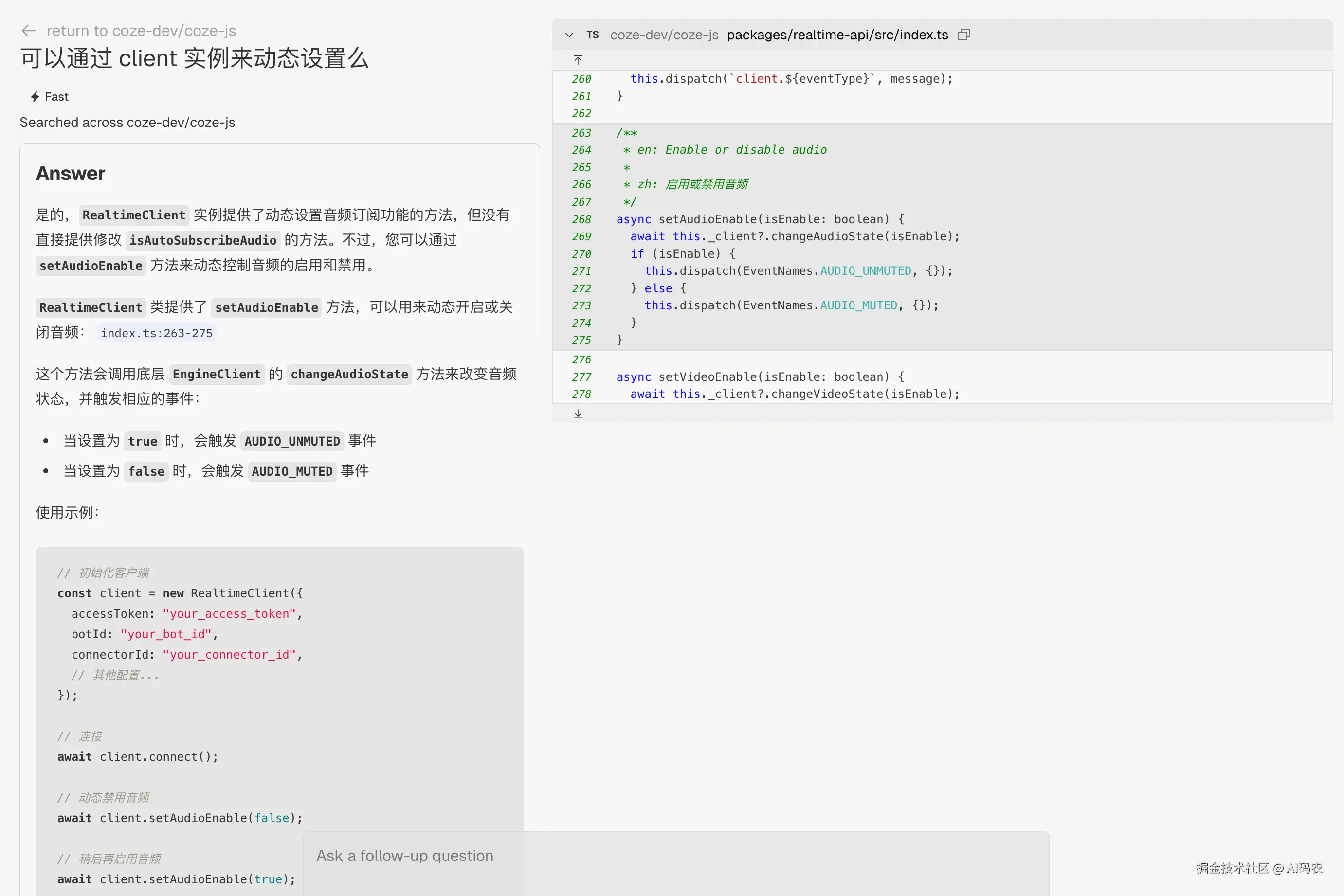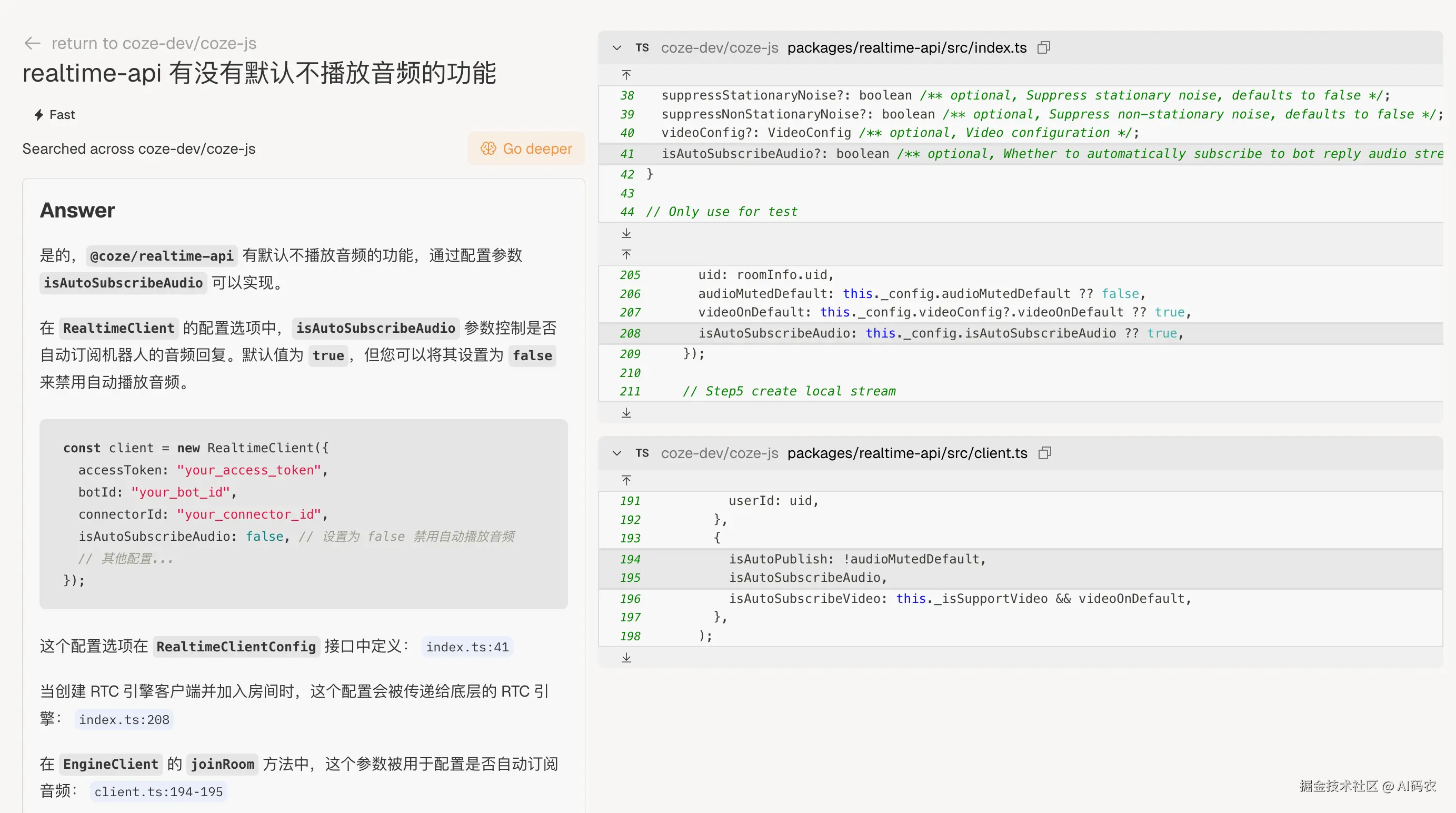 DeepWiki 内置了一个 AI 聊天助手,我试着问了几个问题,比如“realtime-api 有没有默认不播放音频的功能” AI 不仅给出了详细回答,还直接引用了代码片段,解释了实现逻辑。