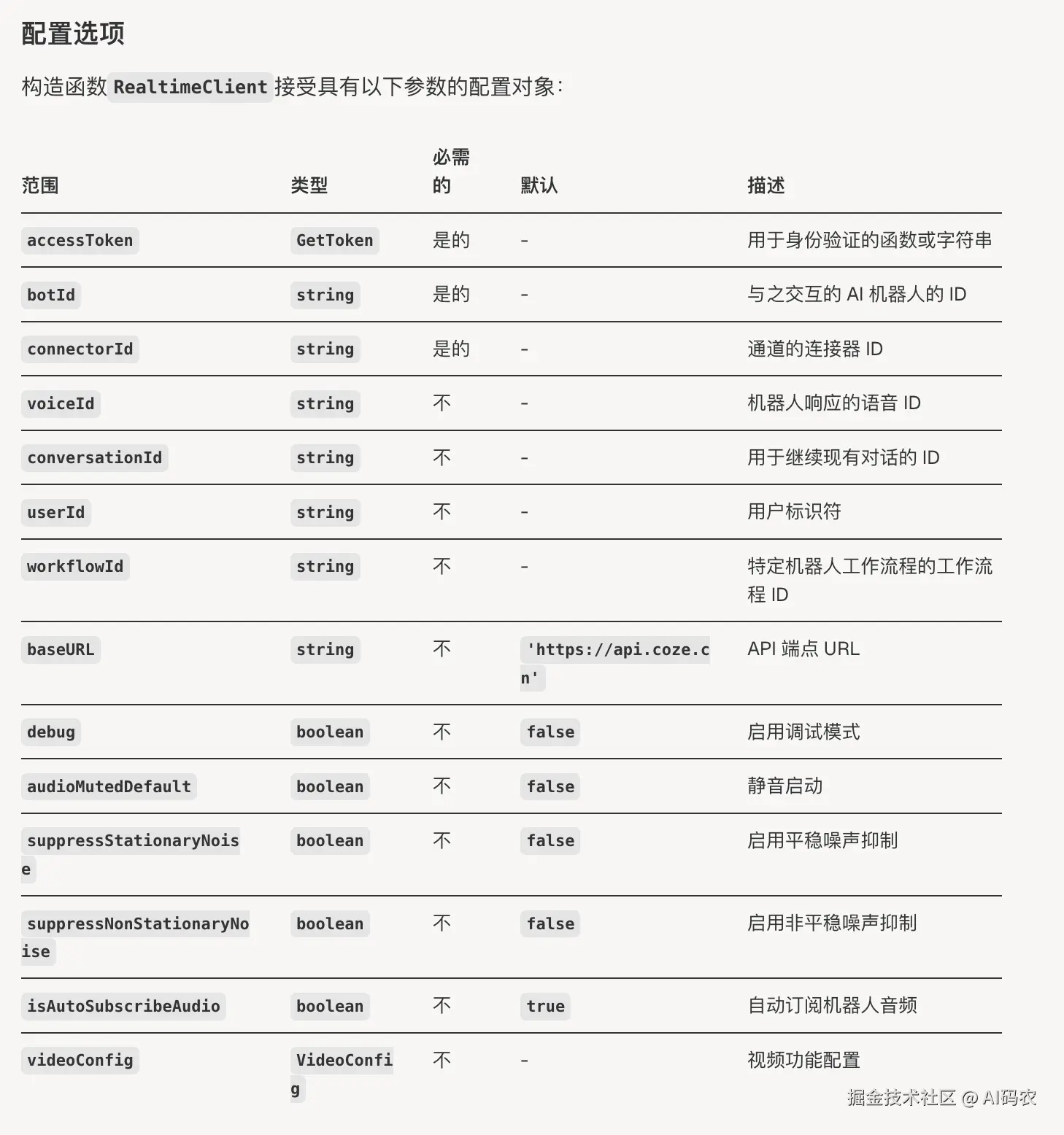 比如下面例子,RealtimeClient 的参数在README并不全,但它通过阅读源码把它补全了,并以表格的形式清晰地呈现出来