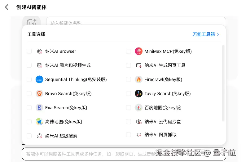 除了本地部署而非云端这种入口不同以外,还有就是产品定位的不同。相信你也注意到了,其他平台都是直接亮相号称支持 MCP 的「超级智能体」,纳米 AI 则上线的是**「万能工具箱」**。