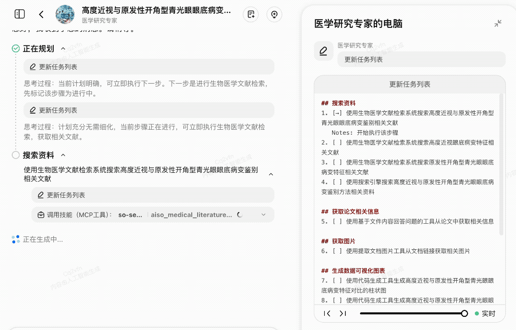 整个过程可以看到,普通用户使用起来非常方便,甚至只需一个提示词,智能体就能够自动分析用户需求并拆解为多个子任务,自主调用 MCP 工具(如浏览器、代码编辑器等)执行任务,并输出完整的结果报告。