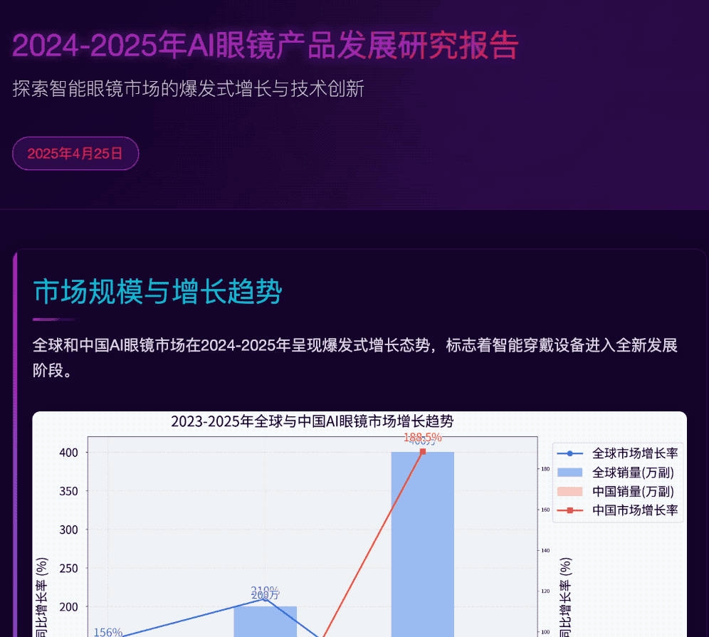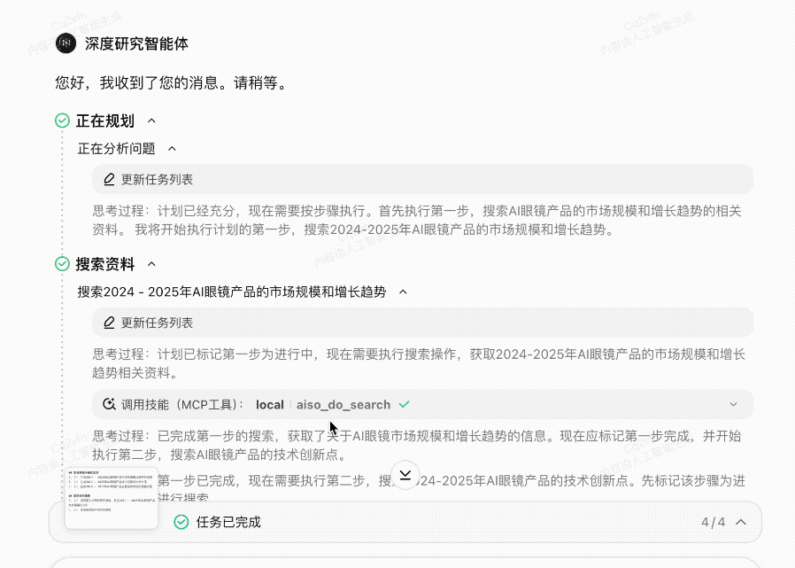 深度分析和研究,是智能体升级之后最喜闻乐见的一项技能。官方正好有个「深度研究智能体」,那就抛出一个问题给到它:2024-2025AI 眼镜产品发展情况。