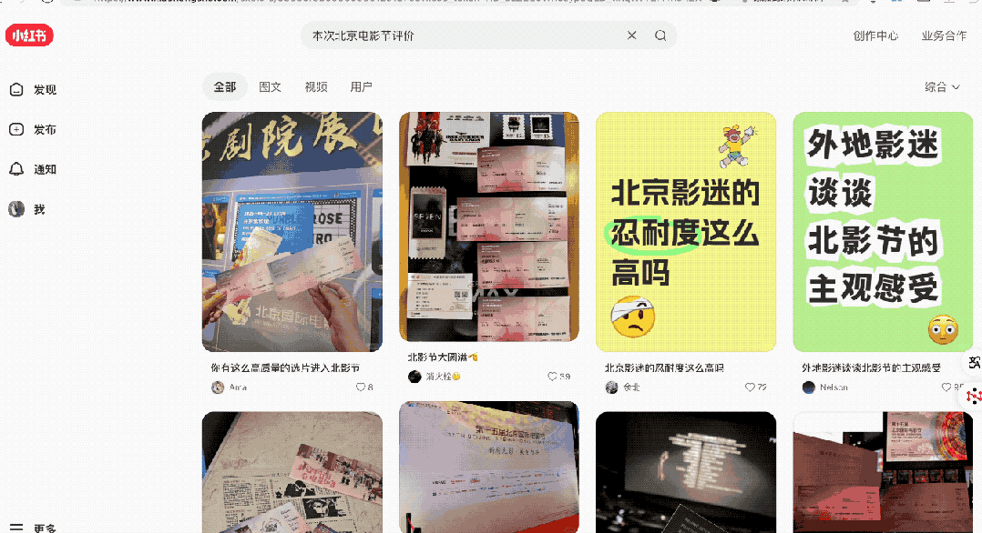 先来看小红书浏览机器人。昨天北影节落下帷幕,来看看大家对于此次北影节的评价。