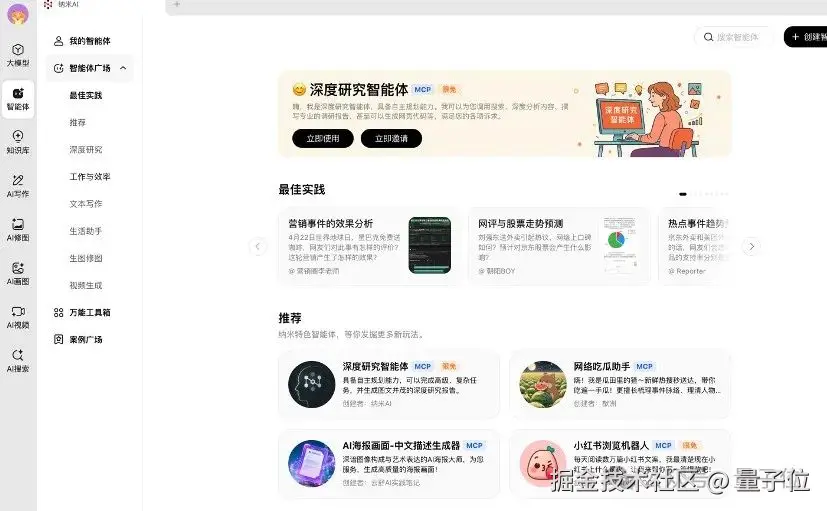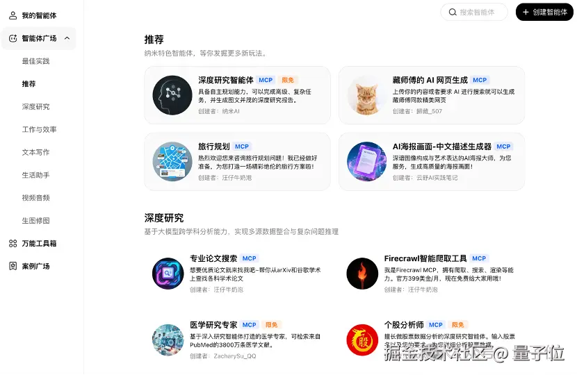 官方已经能看到一些智能体,有官方的,有第三方开发者的,也支持自己手捏一个。其中不少其他平台需要付费的,在纳米 AI 都支持免费集成和调用。