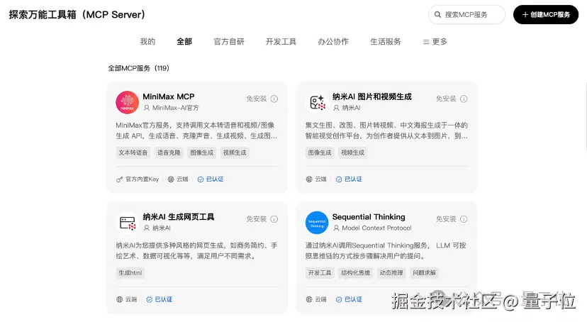 而纳米 AI 工具箱则是主打构建起一个开放的 MCP 生态体系,目前从官网上已经看到,支持超 100 个 MCP 工具。