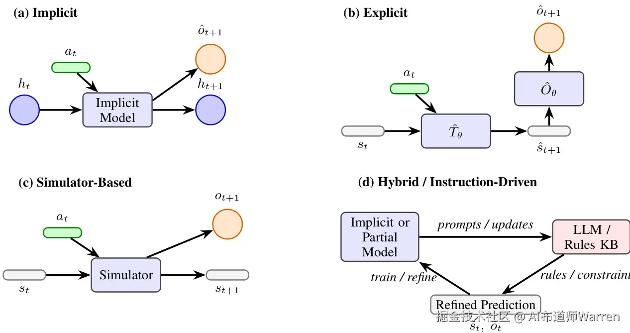 - 隐式范式 (Implicit):整个环境动态(状态转换、观察生成)被编码在一个单一的神经网络(如 RNN 或 Transformer)中,形成一个“黑箱”模型。智能体通过展开这个模型来“想象”未来。LLM 本身有时也被用作隐式世界模型。