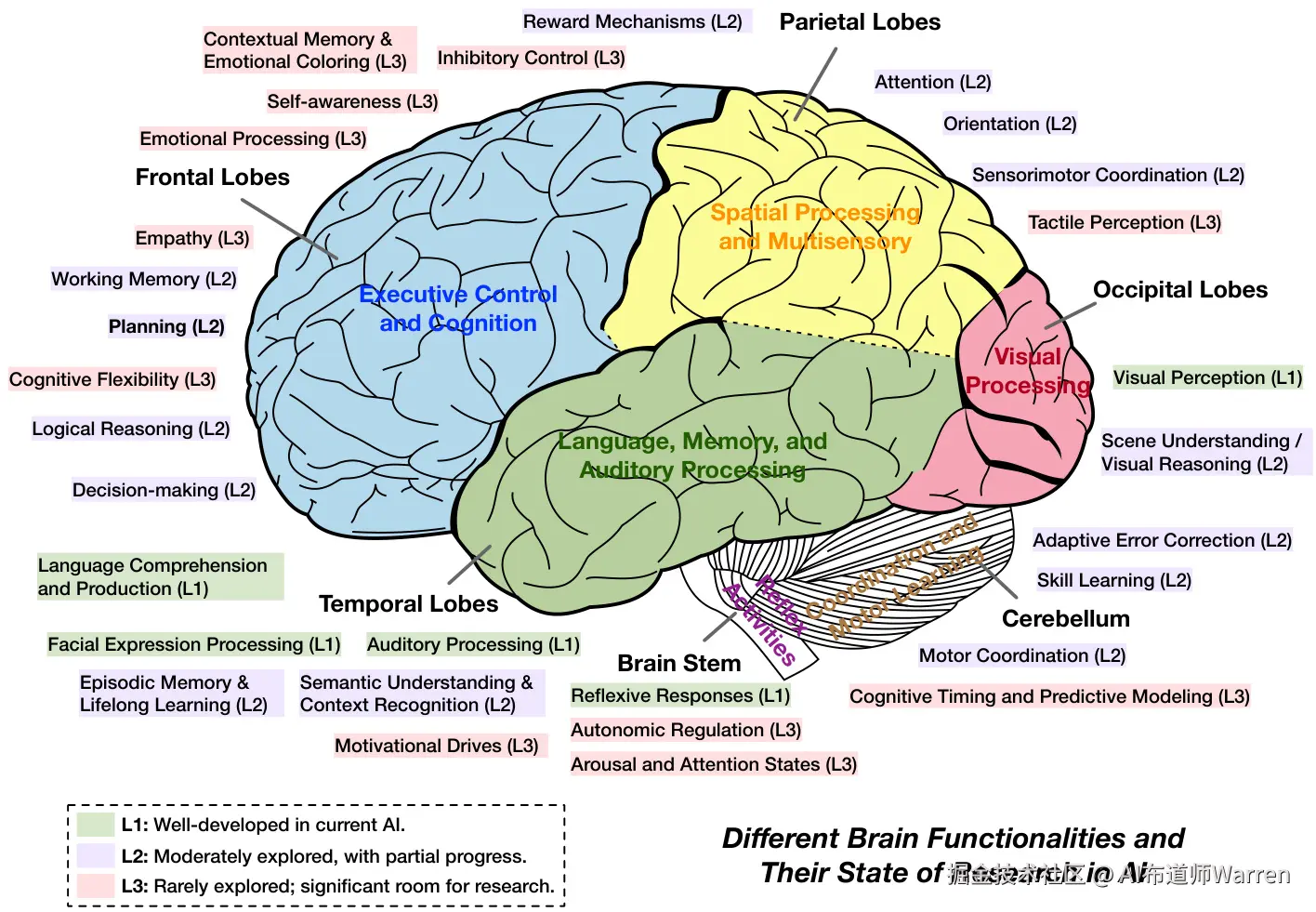 论文将 AI 的发展水平与人脑功能区做了个对应(见下图),分了三个等级: