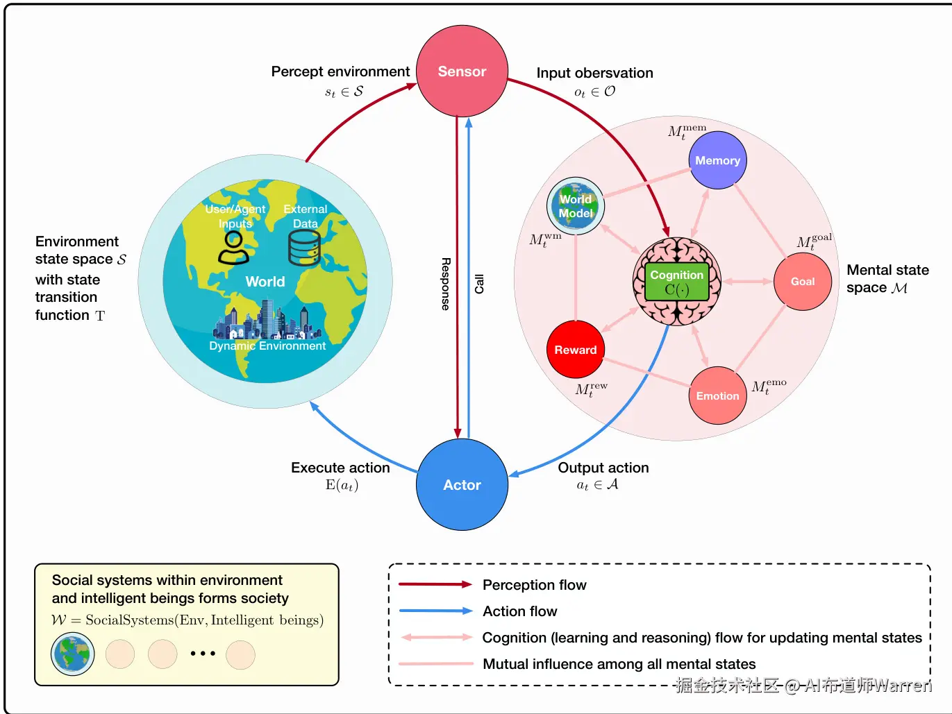 - 世界模型 (World Model, ):对环境如何运作的内部理解和预测。