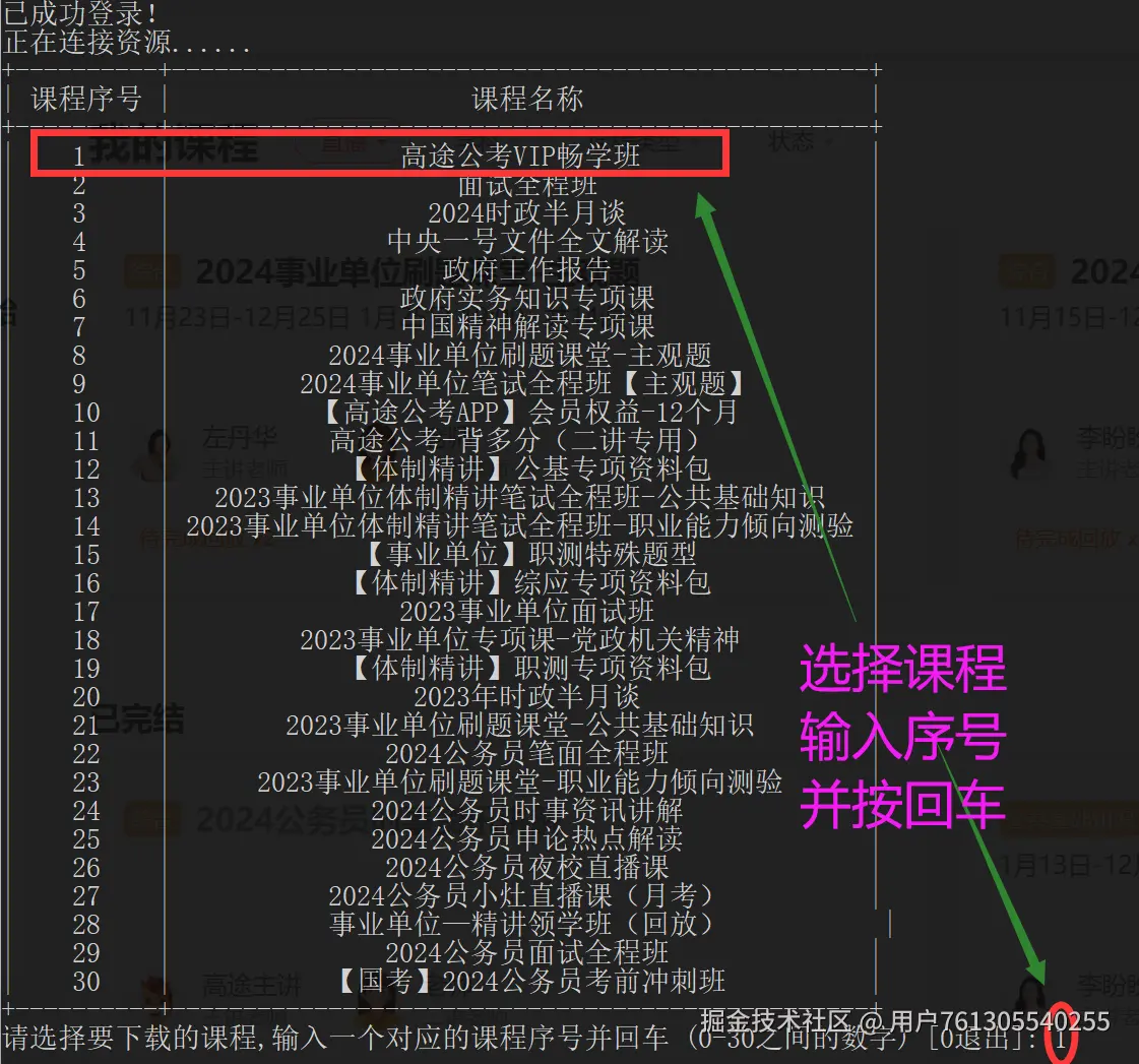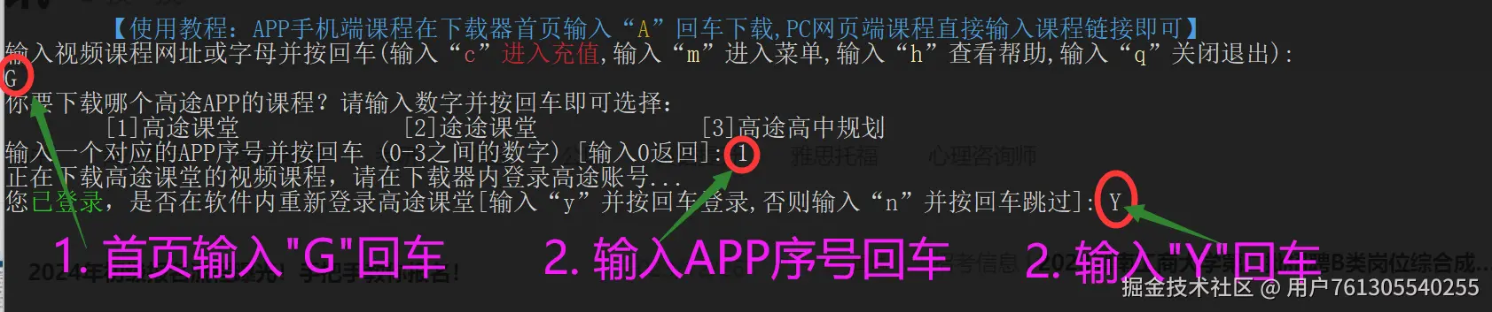【详细教程】如何下载高途和途途上面的已购买的视频课程到本地? 用户761305540255 2025-04-29 489 阅读1分钟 前言:很多同学都想知道高途课堂/途途课堂/高途高中规划的视频课程怎么下载,但是高途上面已购买的视频课程是不提供直接下载方式的,所以下面就教大家如何用学无止下载器下载高途上面已购买的视频课程。 一、下载器首页输入G回车,再输入对应的APP序号并按回车,提示登录,再输入Y登录对应的高途账号 二、此时会有弹窗让你登录,选择对应的登录方式登录高途账号即可 三、登录后会出现已购买的课程列表,找到要下载的课程,输入对应序号并回车 四、然后会提示输入下载选项,直接回车即可,默认下载视频+资料 五、下载好后的文件可在本地路径下的Download目录中找到,可用播放器打开 六、学无止下载器获取方法 www.xuewuzhi.cn/gaotu_downl…