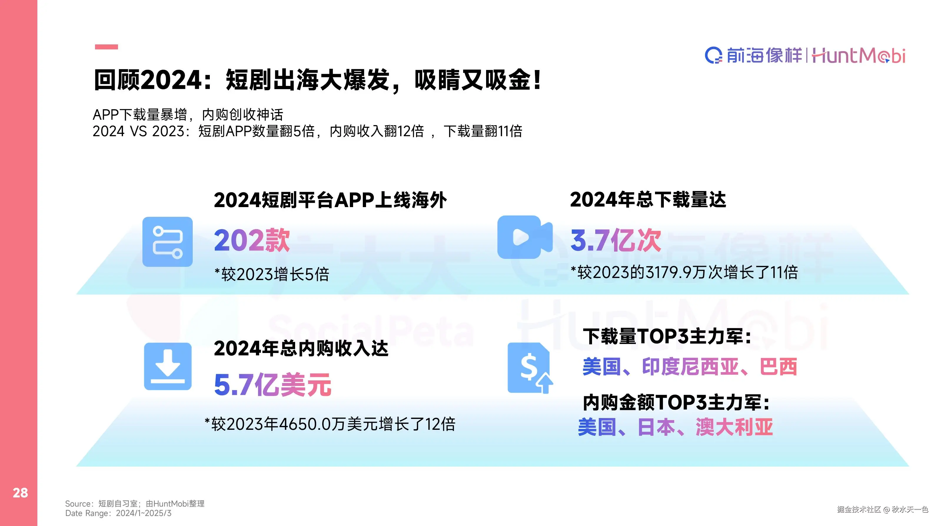 1、市场规模爆发式增长:2024年全球短剧APP下载量达3.7亿次(同比2023年增长11倍),内购收入5.7亿美元(同比2023年增长12倍),美国、印尼、巴西为下载增长主力军。