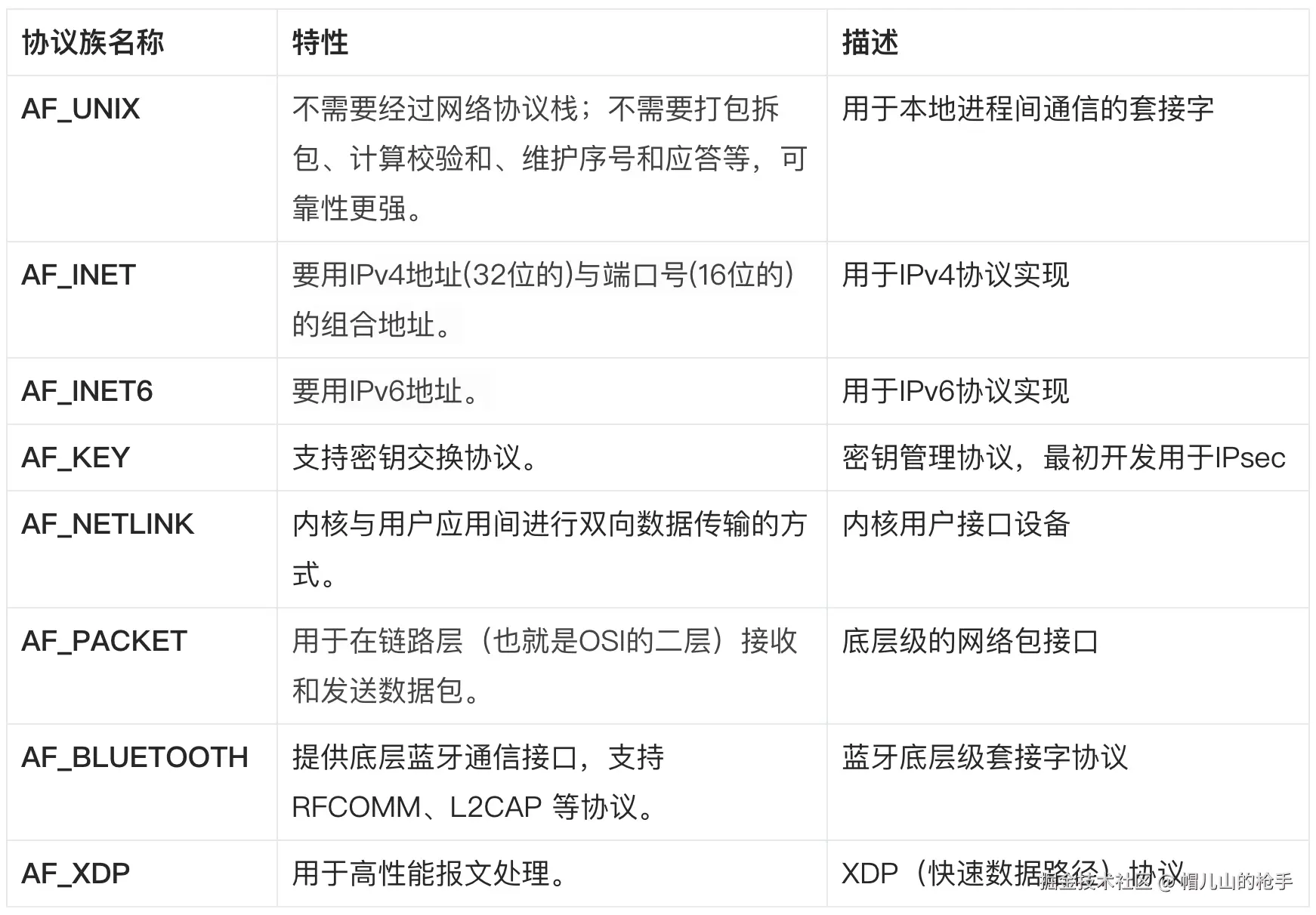 socket参数主要分为三种参数:domain (通信的协议族),type (套接字的类型),protocol (使用的特定协议)。也就是组成socket的三要素。