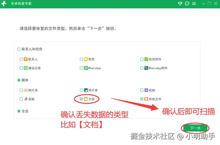 步骤2:连接成功后,你需要选择扫描对象,也就是丢失数据的具体类型。如下图,选择完毕后,点击【下一步】,就能自动扫描了。