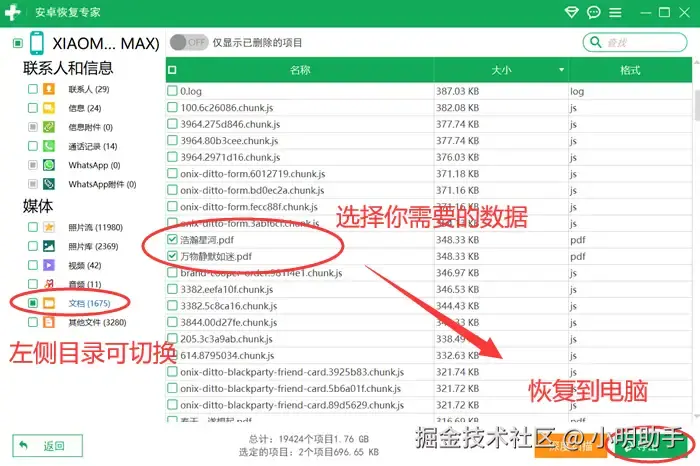 步骤3:扫描结束后,在软件界面左侧会列出可恢复的数据类型,如联系人、短信、照片、视频等,点击就能切换。