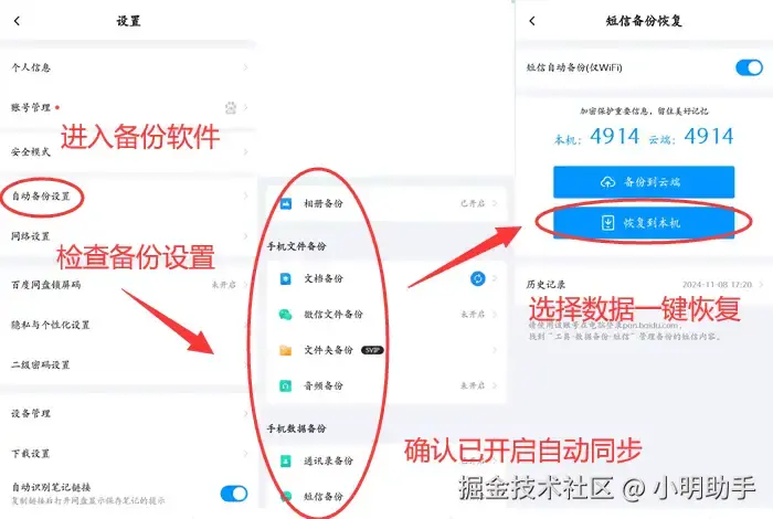 步骤:进入手机备份软件,打开备份设置,选择丢失数据的类型,点击【恢复到本机】,即可一键恢复数据。