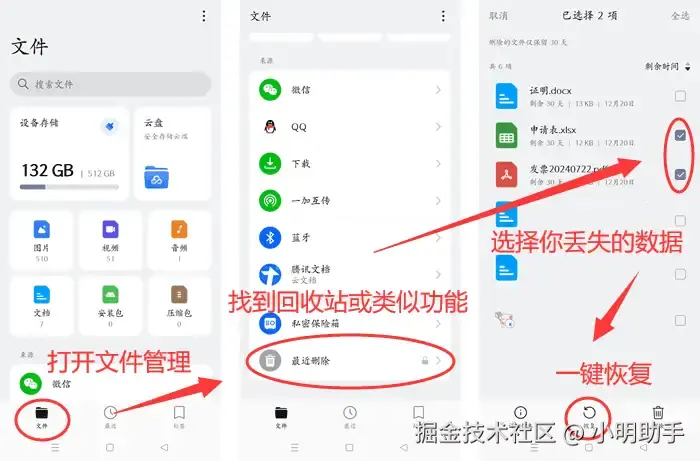 步骤:打开手机文件管理,查找类似回收站的功能并进入,选择丢失的·数据,一键即可【恢复】。