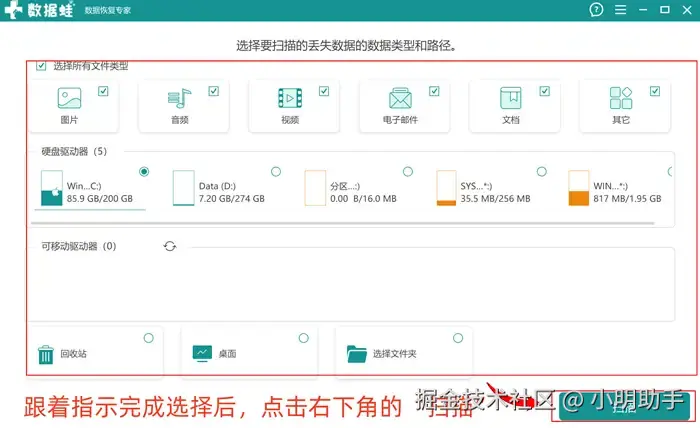 步骤1: 在软件的扫描首页中,按指示勾选出文件类型和需要进行扫描的位置,点击“扫描”;