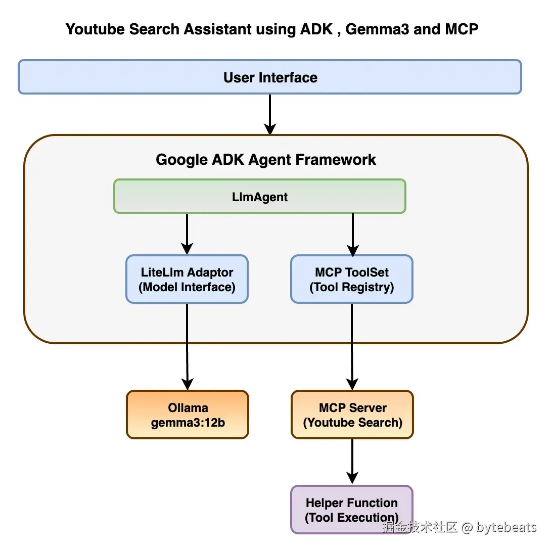 我们将使用 ADK 框架构建一个YouTube 搜索代理, 它将利用 Gemma 3 模型进行推理和生成响应, 并通过 MCP 动态调用工具获取搜索结果.