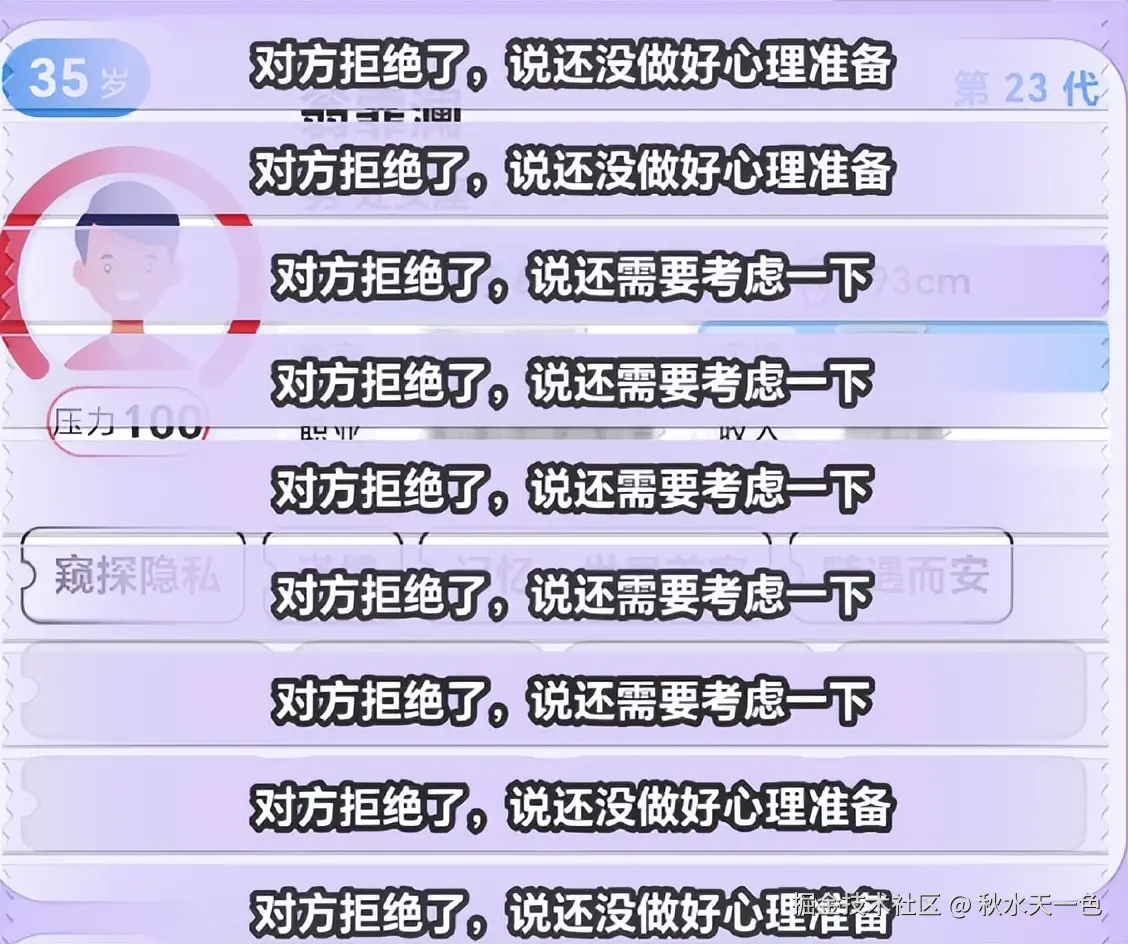 根据游玩时间,玩家的游玩目标主要分为三个阶段:初期的代入式养成→中期的剧情探索→后期的成就解锁,海量文案+AI随机生成+不断提高的结婚门槛共同构成了游戏的耐玩性。因为游戏内的头像、名称、标签都是AI随机生成,也不免有一些左右互搏的矛盾出现,如一边女性主义一边大保健,一边追男宝一边丁克,一边有房无贷一边无房。除去一些无伤大雅的bug外,强随机文本还会闹出不少苏联笑话,例如“身无分文马爸爸”~~