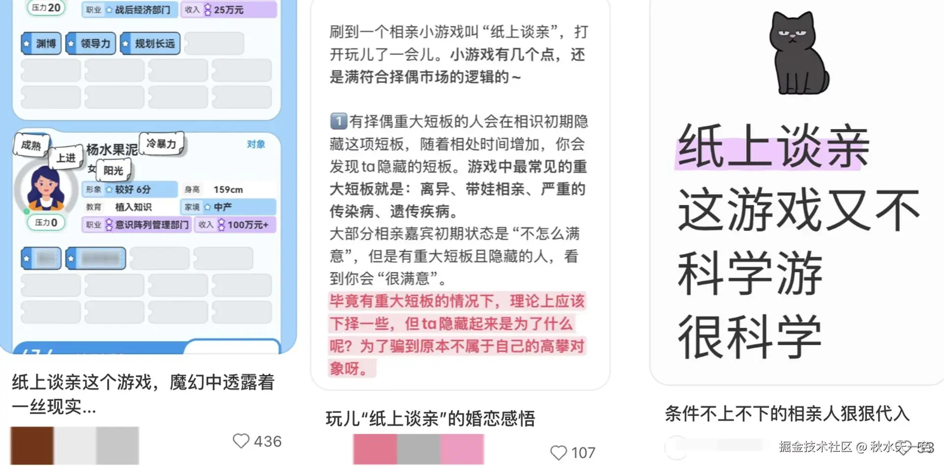 先看题材,爆火的文字小游戏通常与社会热点强绑定,像是中国式xx、疫情生存战略在当时都有扎实的舆论基础。而相亲、婚姻本就是热点中的热点,随便一个“相亲对象想要AA”“相亲对象长得丑”“老婆有弟弟”“该不该给彩礼”的小红书图文贴,点赞评论加起来都得过万。
