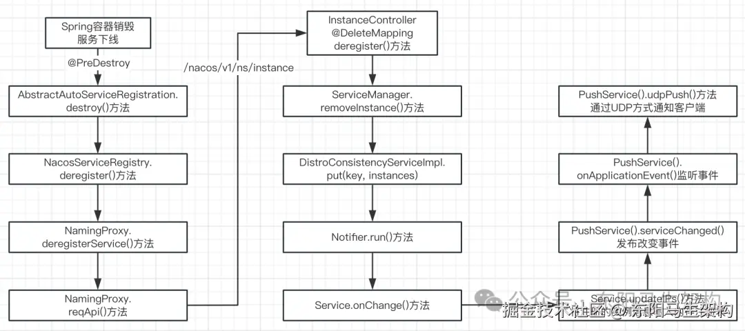 在关闭Spring容器时,会触发Nacos客户端销毁的方法,然后调用Nacos服务端的服务下线接口,从而完成服务下线流程。
